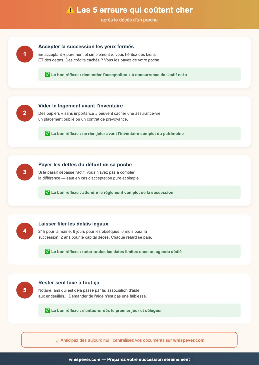 Signer l'acceptation de la succession trop vite. En acceptant « purement et simplement », vous héritez des biens ET des dettes. Si le défunt avait des crédits en cours ou des dettes cachées, vous devrez les assumer sur vos propres deniers. Optez pour l'acceptation « à concurrence de l'actif net » si vous avez le moindre doute — elle protège votre patrimoine personnel.