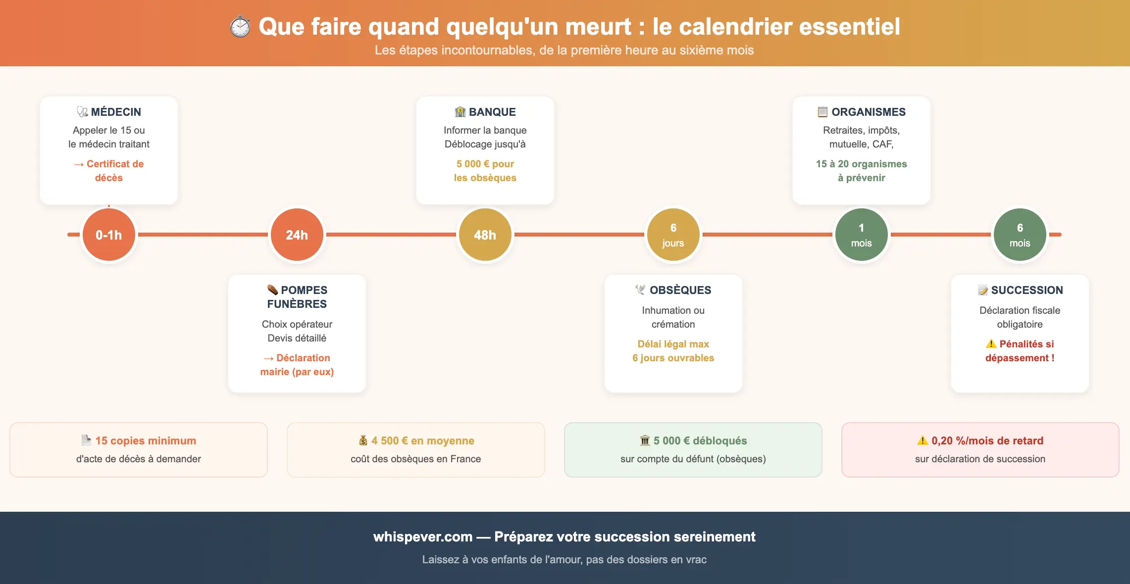 Gardez en tête ces quelques points essentiels : le certificat de décès est le sésame de toutes les démarches. Les pompes funèbres sont votre premier allié. Demandez au moins 15 copies de l'acte de décès. Le délai de 6 mois pour la déclaration de succession est impératif. Et n'acceptez jamais une succession les yeux fermés — renseignez-vous sur les dettes avant.