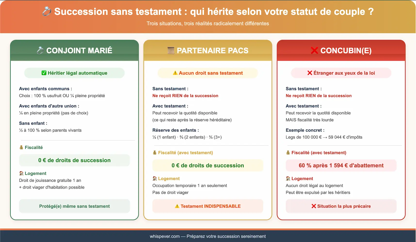 | Concubin protégé ? | ❌ Non | ✅ Partiellement (taxé à 60 %) |