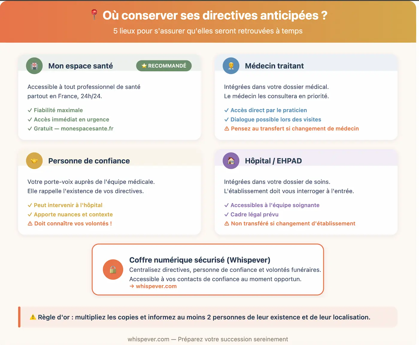 Mon espace santé (monespacesante.fr) : c'est l'option la plus fiable. Vos directives sont enregistrées dans votre dossier médical numérique, accessible à tout professionnel de santé qui vous prend en charge, partout en France. Rendez-vous sur monespacesante.fr pour les téléverser.