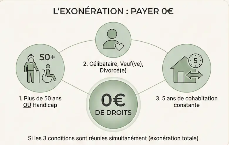 | Héritier remplissant les 3 conditions d'exonération | Totalité de la part reçue | 0% (Exonération totale) |
